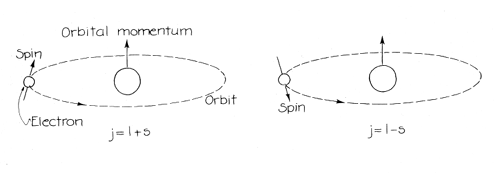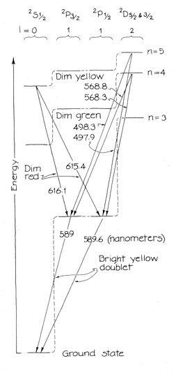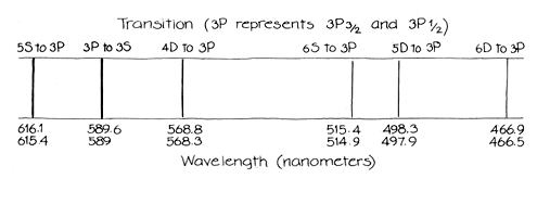 Once the value for n is determined, the value for l can be 0 or any integer up to n - 1. Now it is necessary to turn to another parameter that restricts an intrinsic angular momentum of electrons. Every electron behaves as though it were a miniature top spinning on an axis. This type of angular momentum, which is called spin, is given by the quantum numbers. I want to-caution that these quantum numbers, pictures, energy charts and so on are all merely models associated with an atom. They are not reality of the normal kind. You will never directly observe an electron or sense the quantizing of its orbits and energies in an atom. Indeed, an atom is not simply a miniature solar system and spin is not simply the angular momentum of a tiny top. In the current view the electron is an infinitesimal point to which certain characteristics, among them charge and spin, are attributed. The spectrum of sodium can serve to demonstrate how the quantum numbers figure in atomic spectra. A neutral sodium atom has 11 electrons. Ten of them play no immediate role in an understanding of the spectrum because they form what are called closed shells The concept of a closed shell is based on the quantum-mechanical argument that no two electrons in an atom can have precisely the same set of quantum numbers. The 11th electron is called a valence electron because it lies outside the closed shells. When a sodium atom is unexcited, the valence electron has an n of 3 and an l of 0. There are two more possible values for l (1 and 2), but for the electron to have them it must be given some energy. Instead it might be given enough energy to jump to a state with n of 4 or more. These possibilities for sodium are charted according to energy in Figure 9. The ground state (shown in Figure 12) can be labeled as 32S1/2. S is the traditional way of representing an l value of 0 for the valence electron. The 3 is the value of n. The superscript 2 comes from an equation involving the spin. The subscript brings in a new quantum number j, a combination of l and s. This new number is important because it restricts the total angular momentum of the electron, that is, the combination of its orbital angular momentum and its spin angular momentum. The values of j are computed by adding and subtracting the values of I and s. The largest j value equals the sum of l and s. The lowest value is the subtraction of l and s (ignoring any negative sign that might result). The intermediate values of j are found by subtracting 1 from the largest value until the smallest value is reached. For the ground state the calculation is simple. There l is 0 and s is 1/2. Hence j can only be 1/2, which appears as the subscript on the column label. A sodium atom is more interesting if the valence electron is given some energy, so that (while it is still in the state with n of 3) it has an l of 1, leaving two possible values for j. If l and s are added, j is 3/2. If they are subtracted, j is 1/2. Physically the two situations involve the orientations of the two components of the electron's angular momentum. If the orbital and spin components are in the same direction, j is 3/2. If they are in opposite directions, j is 1/2. The only reason for introducing the quantum number j is that the electron's energy (and thus the atom's) depends on it. The two orientations of the angular momentum (the orbital and spin components) require different energies for the electron. Less energy is required when they are in opposite directions. Slightly more is needed if they are in the same direction. The way to keep track of the situation is to consider the j values. The two states appear in the energy chart as the lowest levels under the labels P3/2 and P1/2. As before, the subscript gives the value of j. The P is the traditional way of representing a value of 1 for l. These two states differ so slightly in energy that they appear to be at the same level in the energy chart. Still, the difference in energy is responsible for a closely spaced doublet of yellow lines in the sodium spectrum.