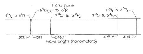 A different set of colors was visible in the spectrum from sodium. The brightest emission from the laboratory lamp was in the yellow at a wavelength of about 589 nanometers. The emission from a sodium streetlight was different partly because the lamp of that light contains a small amount of xenon and mercury, which contribute to the spectrum. Another striking difference is the dark band noticed by Breslow in the midst of the yellow. The difference in the yellow light from the two types of lamp comes from their gas pressure. The pressure in the laboratory lamp is about .02 atmosphere, that in the streetlight about 1.5 atmospheres. In both cases sodium atoms are excited by collisions and emit photons of bright yellow light with a wavelength of 589 nanometers. At the lower pressure the chances are good that a photon can escape from the lamp without being absorbed by another sodium atom in its way. At the higher pressure the photon is likely to be absorbed by another atom and so prevented from escaping. The phenomenon is known as self-absorption. Yellow light is nonetheless visible in the part of the spectrum surrounding the dark band because of the frequent and violent collisions among the atoms. A collision can briefly alter the energy of the electrons in an atom. If during that period the atom deexcites, the light has a wavelength slightly longer or shorter than the normal yellow light. Such light cannot be absorbed by another sodium atom. Thus this yellow light escapes from the lamp without self-absorption.